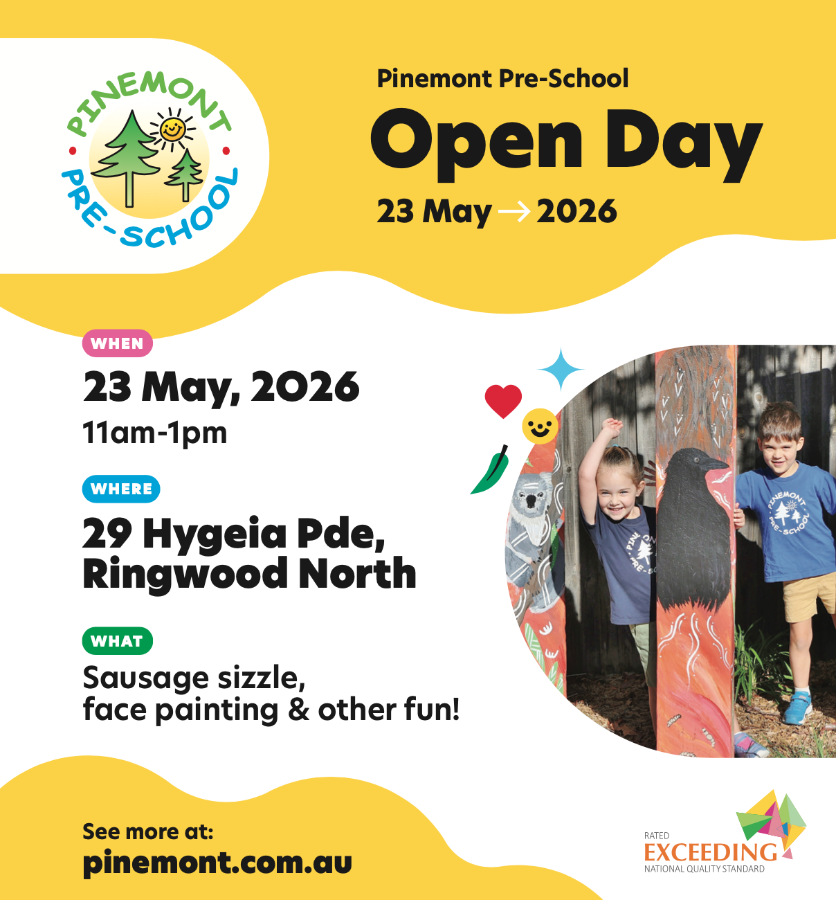 Pinemont’s extended hours program (EHP) has limited places available to children in ORANGE GROUP ONLY and extra fees are payable. Extended hours Program (EHP) supports families that require their child to have longer care on their kinder days.